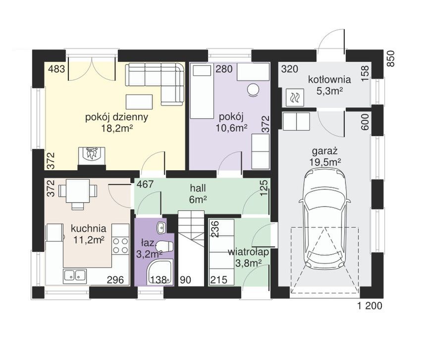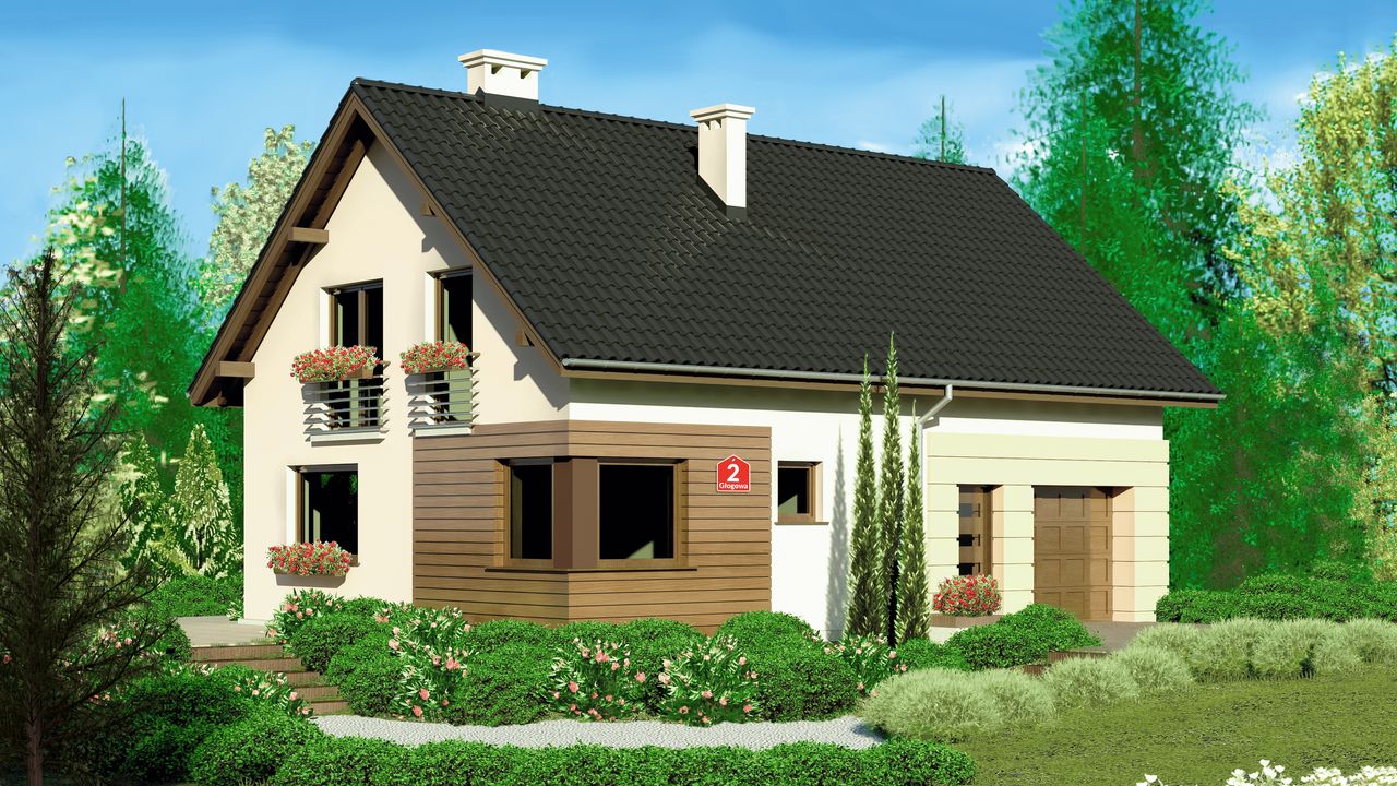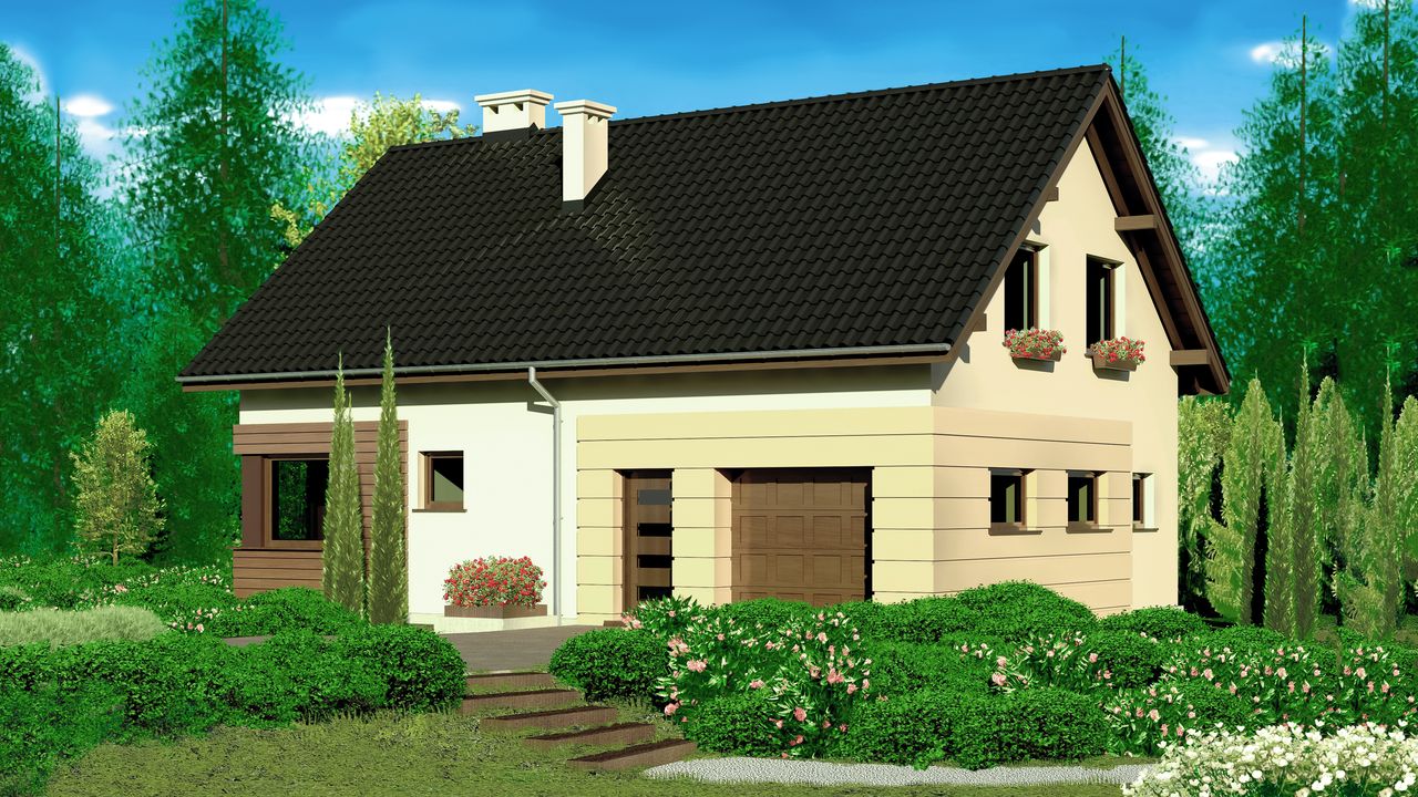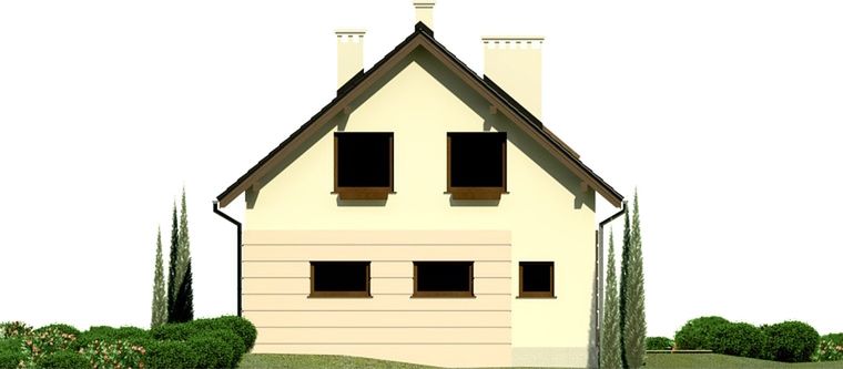 Graficzne opracowanie rzutów poglądowych widocznych na karcie projektu zostało wykonane przez Extradom.pl. Prezentowane przez Extradom.pl wizualizacje wykonane zostały przez autora projektu i należy poczytywać je jedynie za przykład i propozycję wykończenia, wizję architektoniczną autora projektu. Ostateczne wykończenie budynku może nastąpić na wiele sposobów. Szczegółowe rozwiązania zastosowane w oferowanej dokumentacji - w tym również ilość, lokalizacje i wygląd okien, drzwi, kominów - mogą w niewielkim stopniu różnić się od prezentowanej wizualizacji budynku.