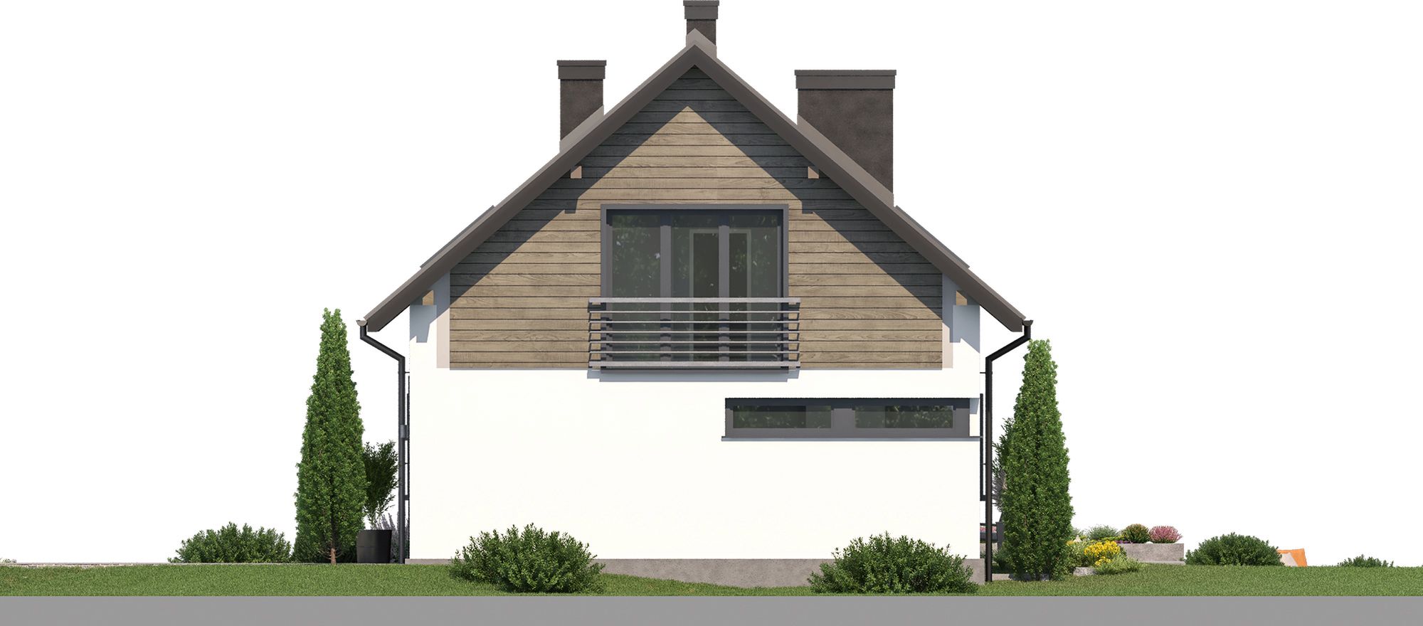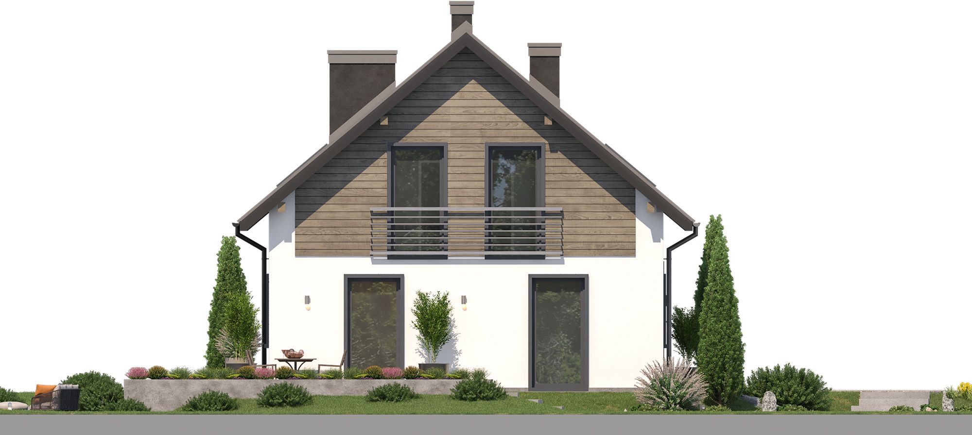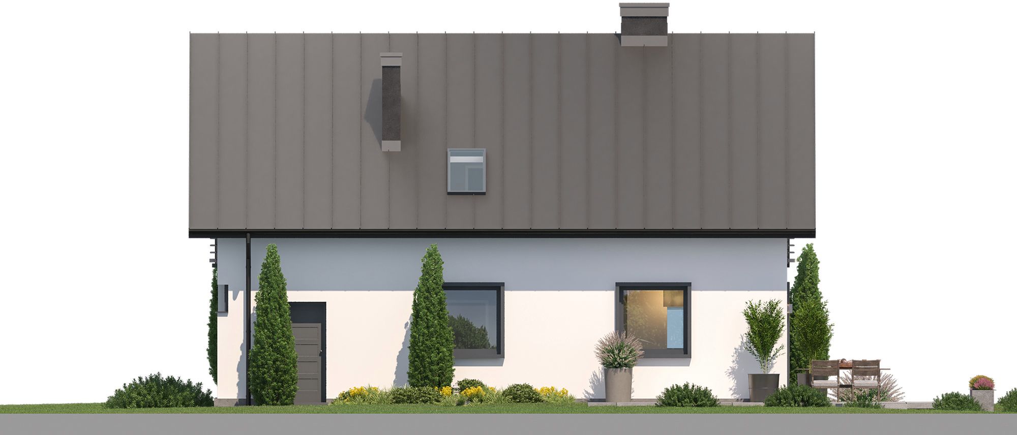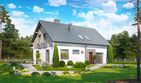 Graficzne opracowanie rzutów poglądowych widocznych na karcie projektu zostało wykonane przez Extradom.pl. Prezentowane przez Extradom.pl wizualizacje wykonane zostały przez autora projektu i należy poczytywać je jedynie za przykład i propozycję wykończenia, wizję architektoniczną autora projektu. Ostateczne wykończenie budynku może nastąpić na wiele sposobów. Szczegółowe rozwiązania zastosowane w oferowanej dokumentacji - w tym również ilość, lokalizacje i wygląd okien, drzwi, kominów - mogą w niewielkim stopniu różnić się od prezentowanej wizualizacji budynku.