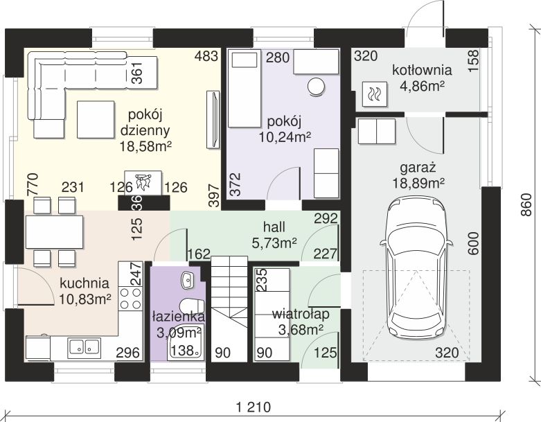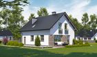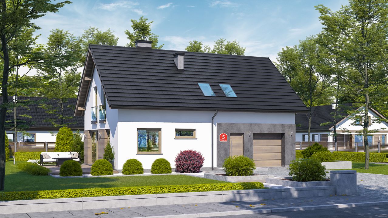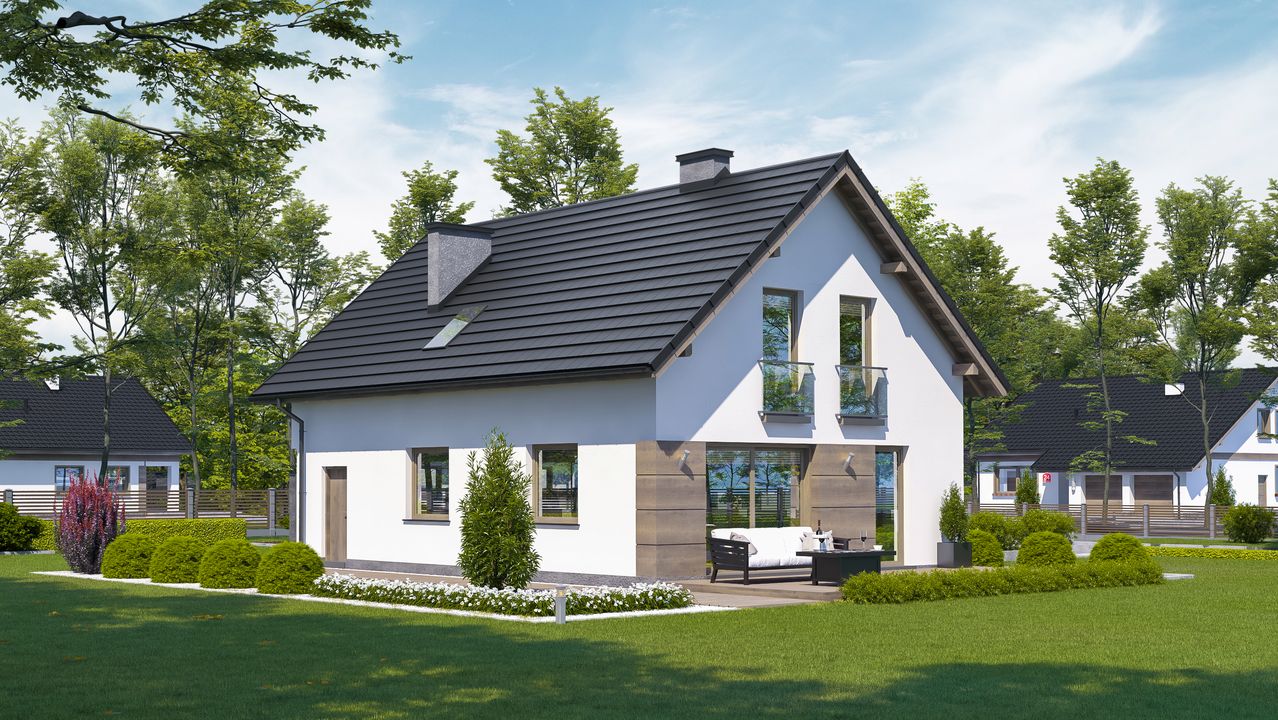 Graficzne opracowanie rzutów poglądowych widocznych na karcie projektu zostało wykonane przez Extradom.pl. Prezentowane przez Extradom.pl wizualizacje wykonane zostały przez autora projektu i należy poczytywać je jedynie za przykład i propozycję wykończenia, wizję architektoniczną autora projektu. Ostateczne wykończenie budynku może nastąpić na wiele sposobów. Szczegółowe rozwiązania zastosowane w oferowanej dokumentacji - w tym również ilość, lokalizacje i wygląd okien, drzwi, kominów - mogą w niewielkim stopniu różnić się od prezentowanej wizualizacji budynku.