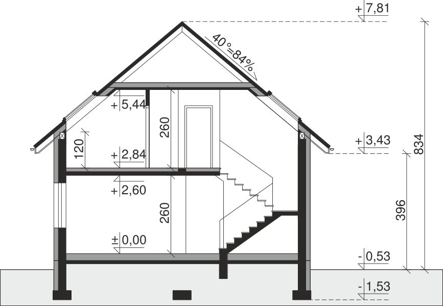 Ściany zewnętrzne: pustak 25 cm, styropian 20 cm. Ściany nośne: pustak 25 cm. Strop: monolityczny żelbetowy. Dach: kąt nachylenia 40°, pokrycie - dachówka ceramiczna lub betonowa. Instalacja solarna.