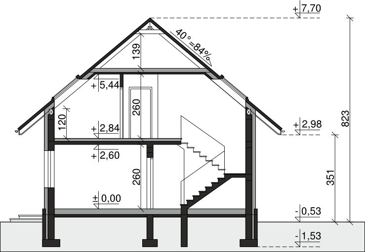 Ściany zewnętrzne: pustak 25 cm, styropian 15 cm. Ściany nośne: pustak 25 cm. Strop: monolityczny żelbetowy. Dach: kąt nachylenia 40°, pokrycie - dachówka ceramiczna lub betonowa.