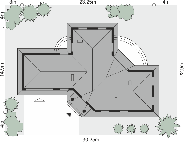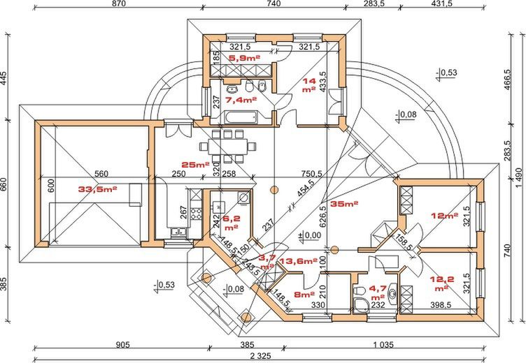 Graficzne opracowanie rzutów poglądowych widocznych na karcie projektu zostało wykonane przez Extradom.pl. Prezentowane przez Extradom.pl wizualizacje wykonane zostały przez autora projektu i należy poczytywać je jedynie za przykład i propozycję wykończenia, wizję architektoniczną autora projektu. Ostateczne wykończenie budynku może nastąpić na wiele sposobów. Szczegółowe rozwiązania zastosowane w oferowanej dokumentacji - w tym również ilość, lokalizacje i wygląd okien, drzwi, kominów - mogą w niewielkim stopniu różnić się od prezentowanej wizualizacji budynku.