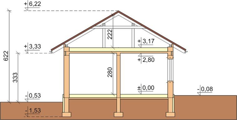 Ściany zewnętrzne: bloczki betonu komórkowego 36,5cm. Ściany nośne: bloczki betonu komórkowego 24 cm. Strop: monolityczny żelbetowy. Dach: kąt nachylenia 30°, pokrycie - dachówka ceramiczna lub betonowa.