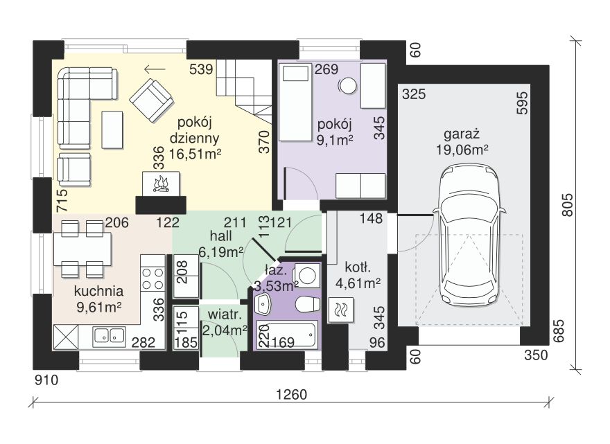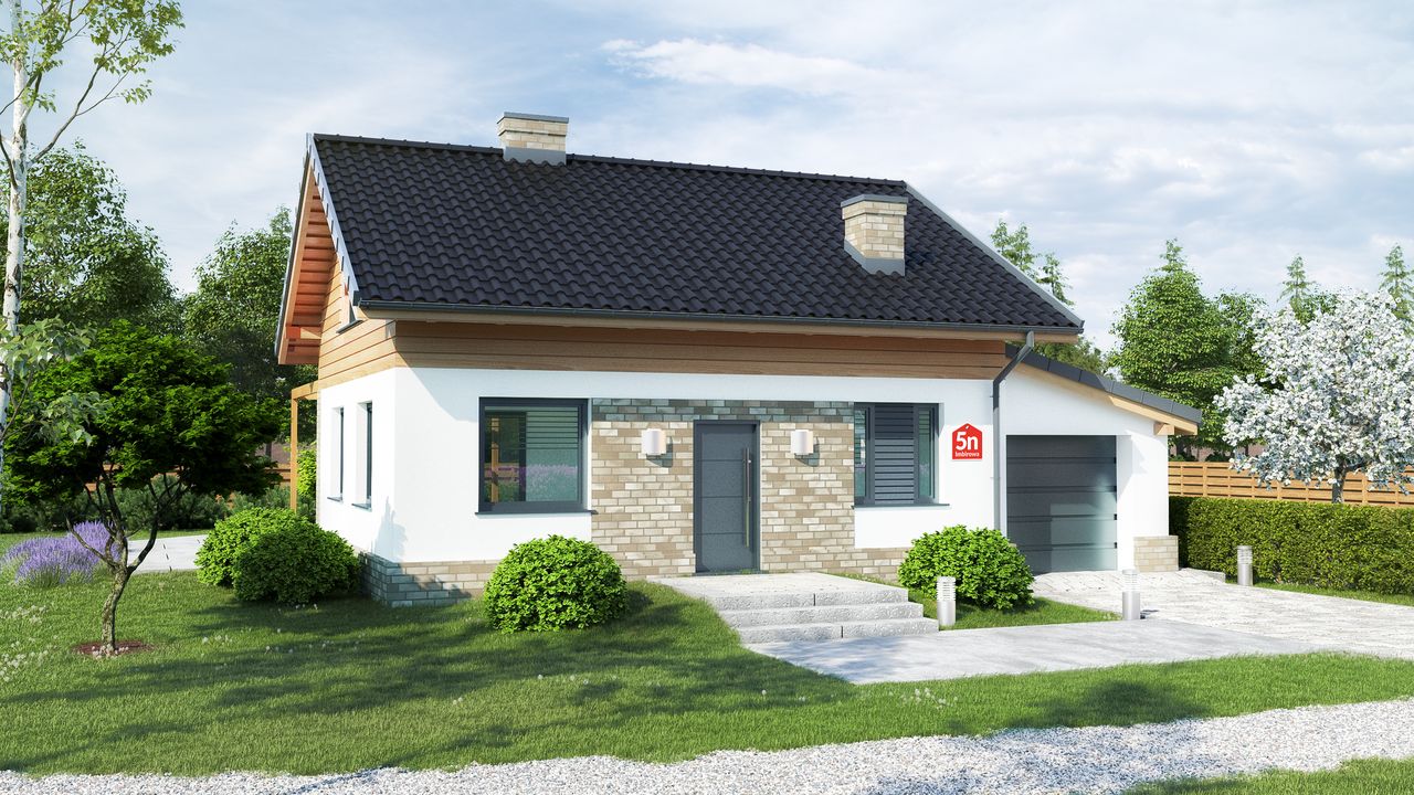 Dom przy Imbirowej 5 N to projekt kompaktowego domu z poddaszem użytkowym i garażem w bryle budynku, stworzony z myślą o potrzebach 3- lub 4-osobowej rodziny. Jego tradycyjna forma i przemyślany układ funkcjonalny oferują komfort i przytulność na optymalnej powierzchni.
