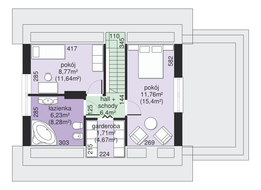 Poddasze to prywatna strefa domowników, zaprojektowana z myślą o odpoczynku i komforcie. Znajduje się tu ustawna sypialnia, która z łatwością pomieści duże łóżko i niezbędne meble. Tuż obok niej zaplanowano praktyczną garderobę, ułatwiającą organizację przechowywania. Całość dopełnia duża, w pełni funkcjonalna łazienka.