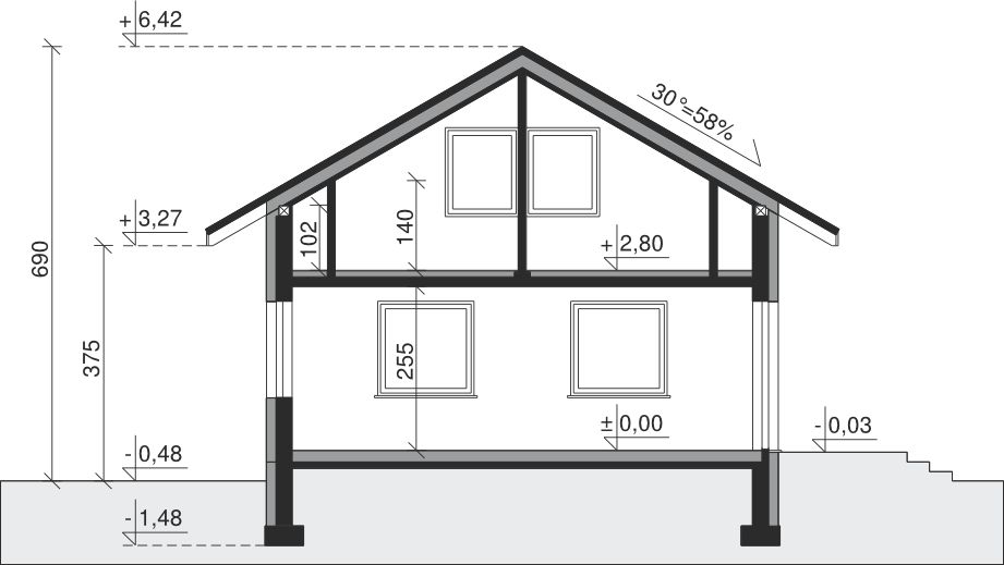 Ściany zewnętrzne: pustak 25 cm, styropian 20 cm. Ściany nośne: pustak 25 cm. Strop: monolityczny żelbetowy. Dach: kąt nachylenia 30°, pokrycie - dachówka ceramiczna lub betonowa. Instalacja solarna.