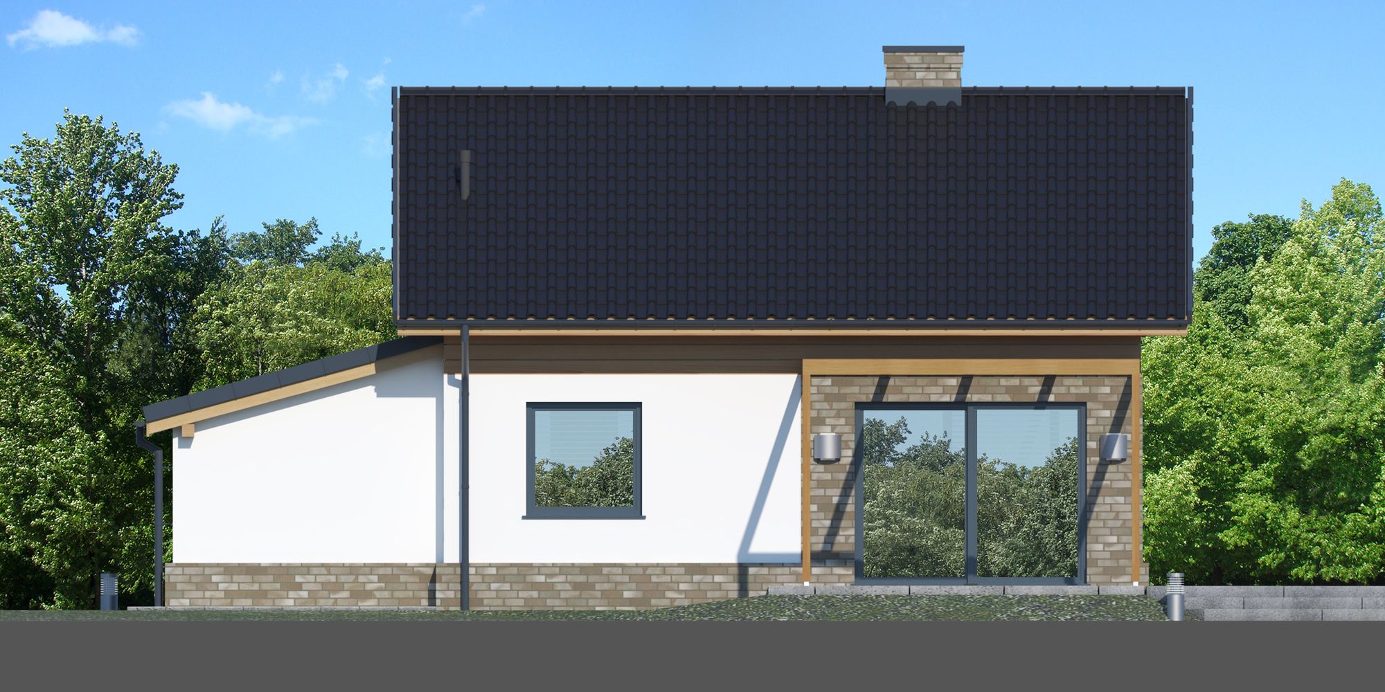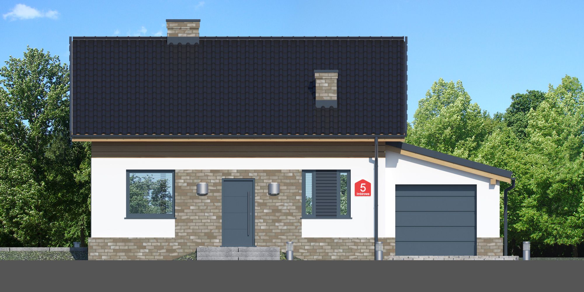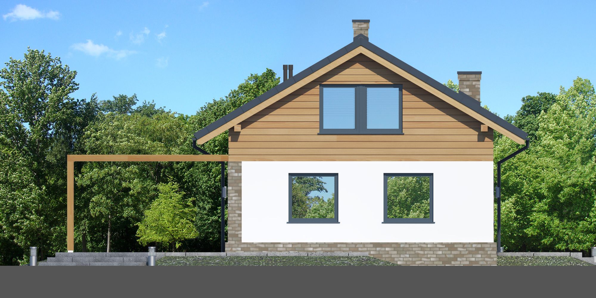 Projekt charakteryzuje się prostą, zwartą bryłą przykrytą klasycznym, dwuspadowym dachem, co jest rozwiązaniem sprawdzonym i ekonomicznym w realizacji. Garaż jednostanowiskowy został zintegrowany z linią budynku, tworząc spójną i harmonijną całość. Tradycyjny styl domu podkreśla jego ponadczasowy charakter, dzięki czemu z łatwością wkomponuje się w każde otoczenie.