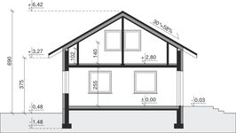 Ściany zewnętrzne: pustak 25 cm, styropian 20 cm. Ściany nośne: pustak 25 cm. Strop: monolityczny żelbetowy. Dach: kąt nachylenia 30°, pokrycie - dachówka ceramiczna lub betonowa.