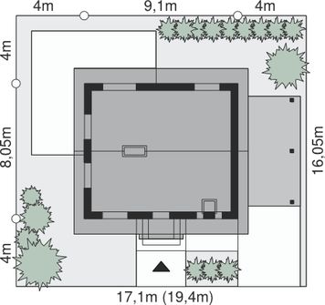 Najmniejsza możliwa długość działki niezbędna do wybudowania wybranego domu. Składa się z długości elewacji domu powiększonej z obu stron o 3 m dla ściany bez otworów drzwiowych/okiennych lub 4 m, dla ściany z otworami.
