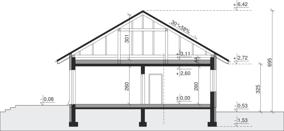 Ściany zewnętrzne: pustak 25 cm, styropian 15 cm. Ściany nośne: pustak 25 cm. Strop: monolityczny żelbetowy. Dach: kąt nachylenia 30°, pokrycie - dachówka ceramiczna lub betonowa.
