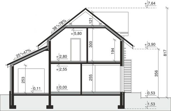 Ściany zewnętrzne: pustak 18 cm, styropian 15 cm. Ściany nośne: pustak 18 cm. Strop: monolityczny żelbetowy. Dach: kąt nachylenia 38°, pokrycie - dachówka ceramiczna lub betonowa.