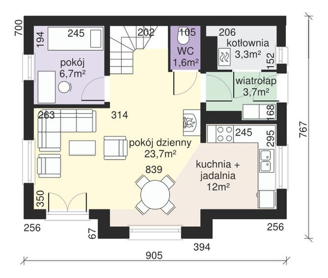Graficzne opracowanie rzutów poglądowych widocznych na karcie projektu zostało wykonane przez Extradom.pl. Prezentowane przez Extradom.pl wizualizacje wykonane zostały przez autora projektu i należy poczytywać je jedynie za przykład i propozycję wykończenia, wizję architektoniczną autora projektu. Ostateczne wykończenie budynku może nastąpić na wiele sposobów. Szczegółowe rozwiązania zastosowane w oferowanej dokumentacji - w tym również ilość, lokalizacje i wygląd okien, drzwi, kominów - mogą w niewielkim stopniu różnić się od prezentowanej wizualizacji budynku.