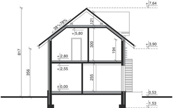 Ściany zewnętrzne: cegła silikatowa 18 cm, styropian 15 cm. Ściany nośne: cegła silikatowa 18 cm. Strop: monolityczny żelbetowy. Dach: kąt nachylenia 38°, pokrycie - dachówka ceramiczna lub betonowa.