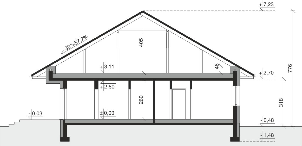 Ściany zewnętrzne: pustak 25 cm, styropian 20 cm. Ściany nośne: pustak 25 cm. Strop: monolityczny żelbetowy. Dach: kąt nachylenia 30°, pokrycie - dachówka ceramiczna lub betonowa. Instalacja solarna.