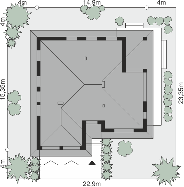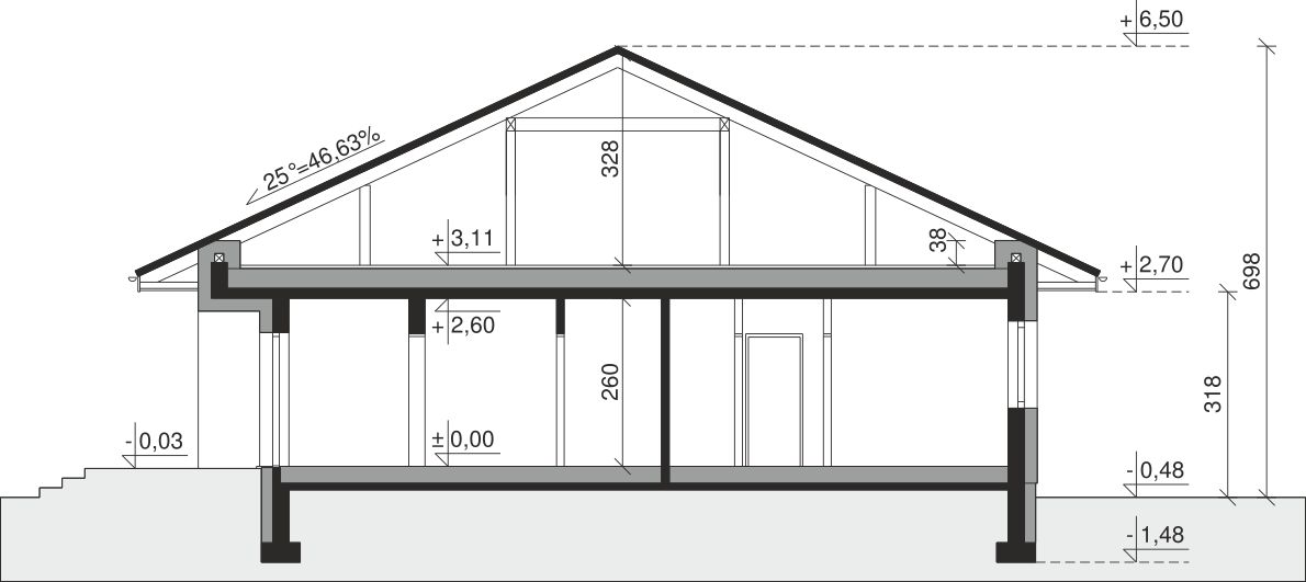 Ściany zewnętrzne: pustak 25 cm, styropian 20 cm. Ściany nośne: pustak 25 cm. Strop: monolityczny żelbetowy. Dach: kąt nachylenia 25°, pokrycie - dachówka ceramiczna lub betonowa.