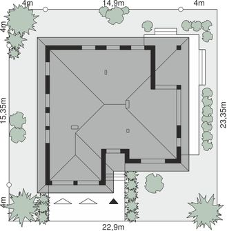 Ściany zewnętrzne: pustak 25 cm, styropian 20 cm. Ściany nośne: pustak 25 cm. Strop: monolityczny żelbetowy. Dach: kąt nachylenia 30°, pokrycie - dachówka ceramiczna lub betonowa.