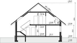 Ściany zewnętrzne: pustak 29 cm, styropian 15 cm. Ściany nośne: pustak 19 cm. Strop: monolityczny żelbetowy. Dach: kąt nachylenia 38°, pokrycie - dachówka ceramiczna lub betonowa.