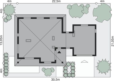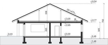 Ściany zewnętrzne: pustak 25 cm, styropian 15 cm. Ściany nośne: pustak 25 cm. Strop: monolityczny żelbetowy. Dach: kąt nachylenia 25°, pokrycie - dachówka ceramiczna lub betonowa.