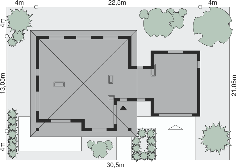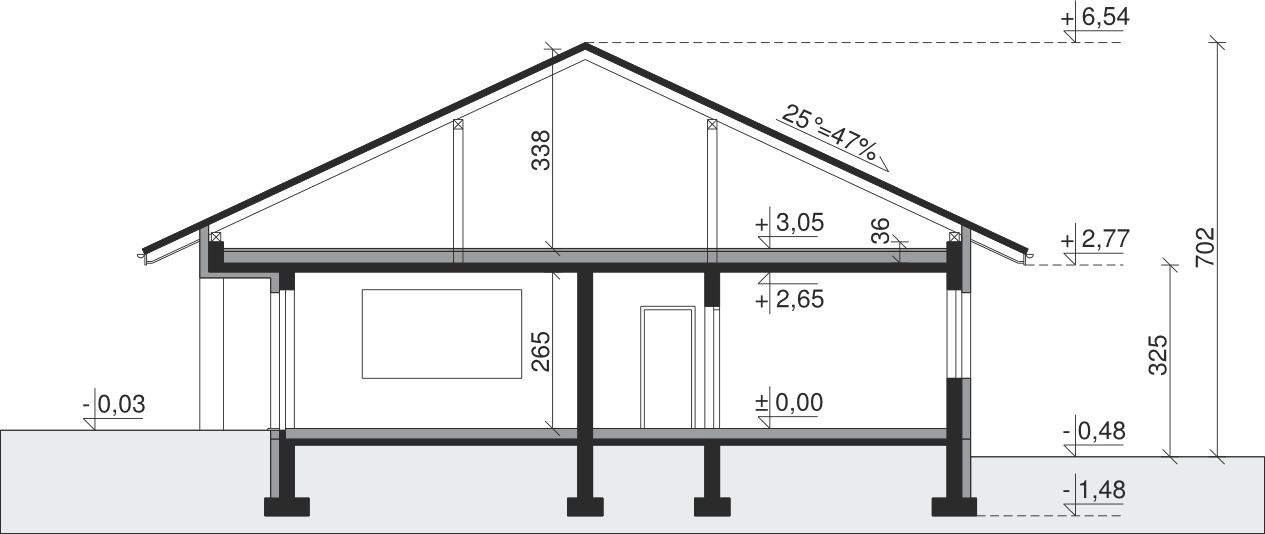 Ściany zewnętrzne: pustak 25 cm, styropian 15 cm. Ściany nośne: pustak 25 cm. Strop: monolityczny żelbetowy. Dach: kąt nachylenia 30°, pokrycie - dachówka ceramiczna lub betonowa.