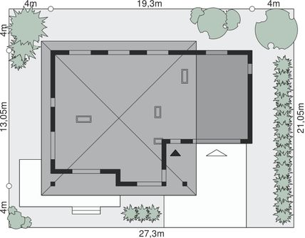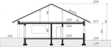 Ściany zewnętrzne: pustak 25 cm, styropian 15 cm. Ściany nośne: pustak 25 cm. Strop: monolityczny żelbetowy. Dach: kąt nachylenia 25°, pokrycie - dachówka ceramiczna lub betonowa.