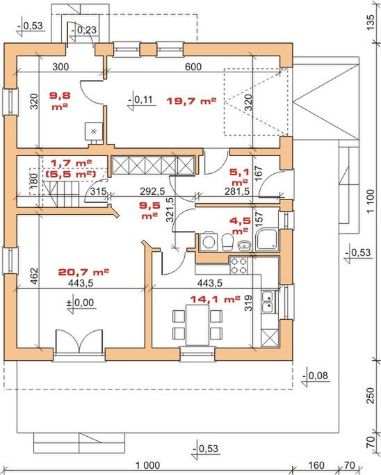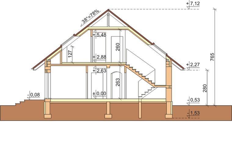 Ściany zewnętrzne: pustak 44 cm. Ściany nośne: pustak 25 cm. Strop: monolityczny żelbetowy. Dach: kąt nachylenia 38°, pokrycie - dachówka ceramiczna lub betonowa.