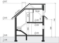 Ściany zewnętrzne: pustak 25 cm, styropian 20 cm. Ściany nośne: pustak 25 cm. Strop: monolityczny żelbetowy. Dach: kąt nachylenia 40°, pokrycie - dachówka ceramiczna lub betonowa. Instalacja solarna.