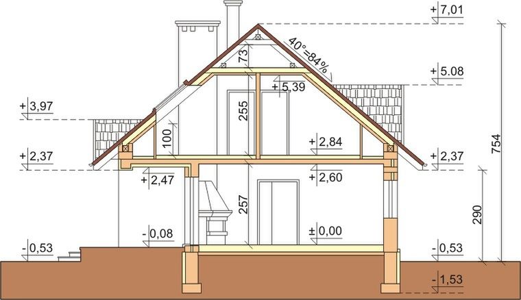 Ściany: pustak ceramiczny 44 cm. Ściany nośne: pustak ceramiczny 19 cm. Strop: monolityczny żelbetowy. Pokrycie dachu: dachówka ceramiczna lub betonowa.