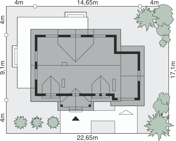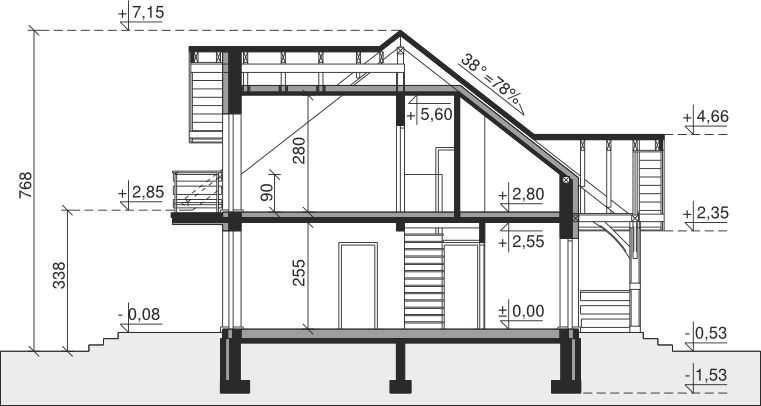 Ściany zewnętrzne: pustak 29 cm, styropian 15 cm. Ściany nośne: pustak 19 cm. Strop: monolityczny żelbetowy. Dach: kąt nachylenia 38°, pokrycie - dachówka ceramiczna lub betonowa.