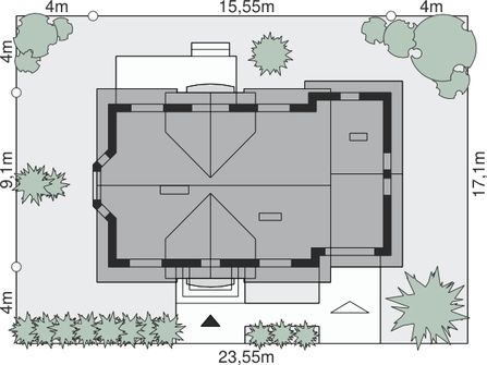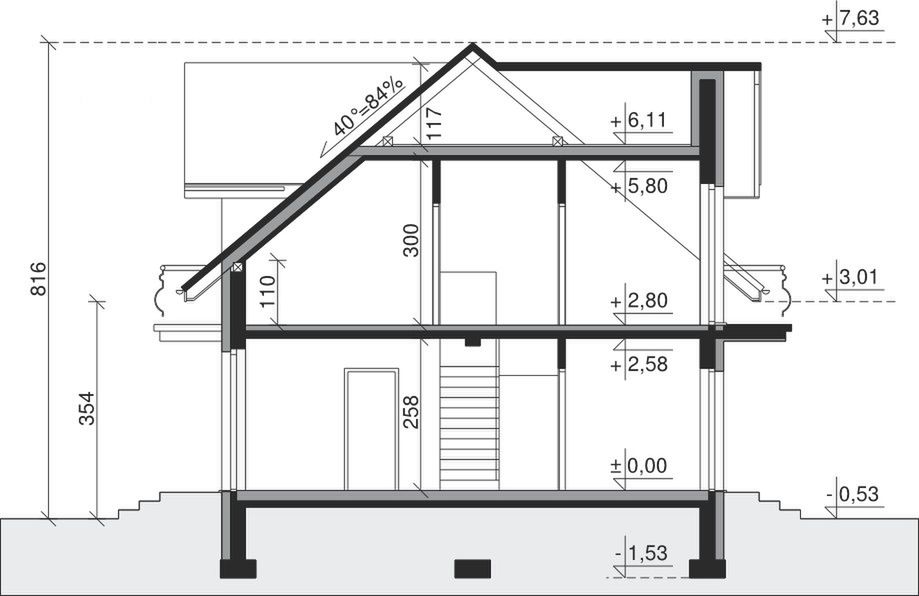 Ściany zewnętrzne: pustak 25 cm, styropian 15 cm. Ściany nośne: pustak 25 cm. Strop: monolityczny żelbetowy. Dach: kąt nachylenia 40°, pokrycie - dachówka ceramiczna lub betonowa.