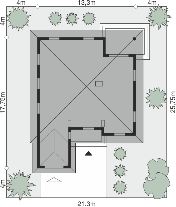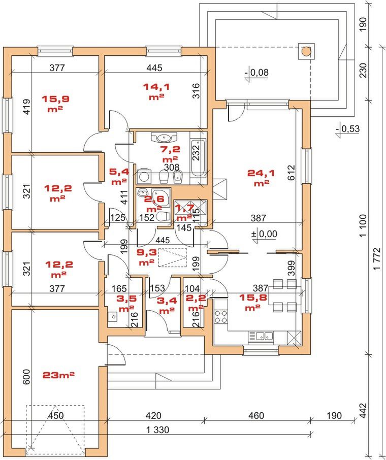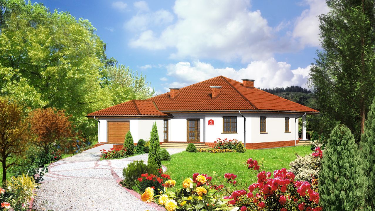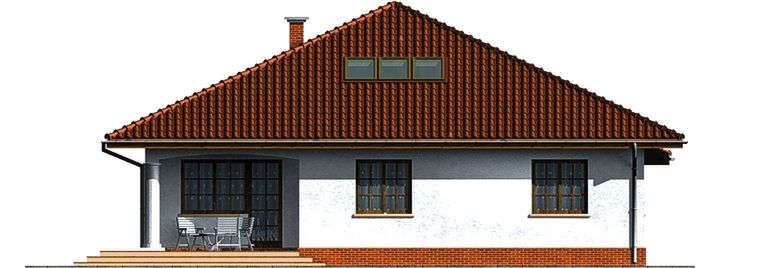 Graficzne opracowanie rzutów poglądowych widocznych na karcie projektu zostało wykonane przez Extradom.pl. Prezentowane przez Extradom.pl wizualizacje wykonane zostały przez autora projektu i należy poczytywać je jedynie za przykład i propozycję wykończenia, wizję architektoniczną autora projektu. Ostateczne wykończenie budynku może nastąpić na wiele sposobów. Szczegółowe rozwiązania zastosowane w oferowanej dokumentacji - w tym również ilość, lokalizacje i wygląd okien, drzwi, kominów - mogą w niewielkim stopniu różnić się od prezentowanej wizualizacji budynku.