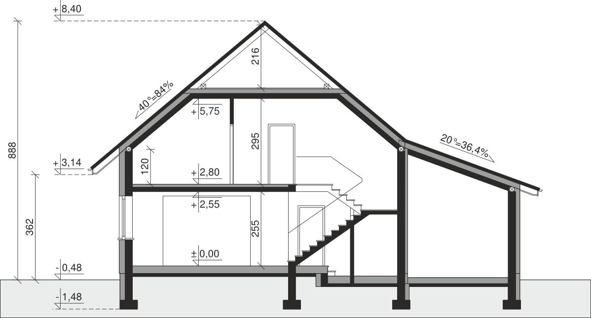 Ściany zewnętrzne: pustak 25 cm, styropian 20 cm. Ściany nośne: pustak 25 cm. Strop: monolityczny żelbetowy. Dach: kąt nachylenia 40°, pokrycie - dachówka ceramiczna lub betonowa.
