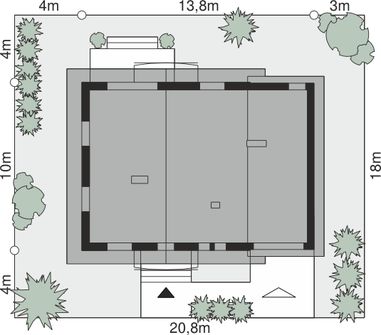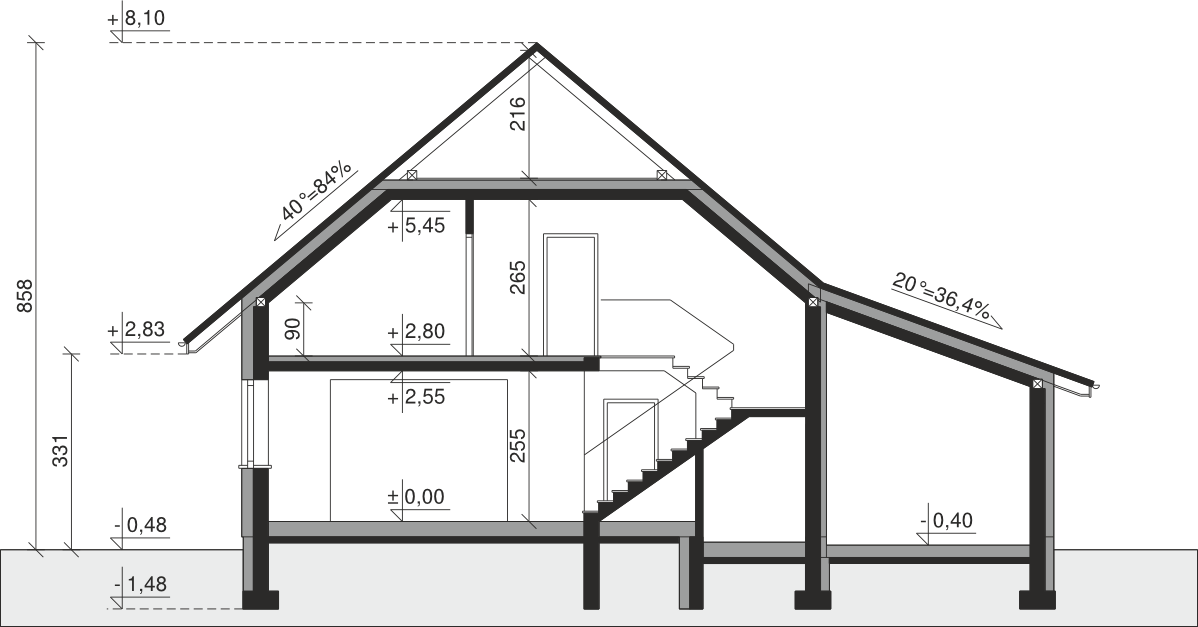 Ściany zewnętrzne: pustak 25 cm, styropian 20 cm. Ściany nośne: pustak 25 cm. Strop: monolityczny żelbetowy. Dach: kąt nachylenia 40°, pokrycie - dachówka ceramiczna lub betonowa. Instalacja solarna.