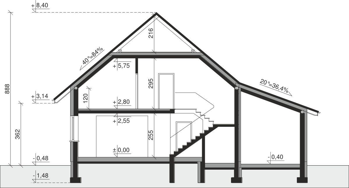 Ściany zewnętrzne: pustak 25 cm, styropian 20 cm. Ściany nośne: pustak 25 cm. Strop: monolityczny żelbetowy. Dach: kąt nachylenia 40°, pokrycie - dachówka ceramiczna lub betonowa. Instalacja solarna.