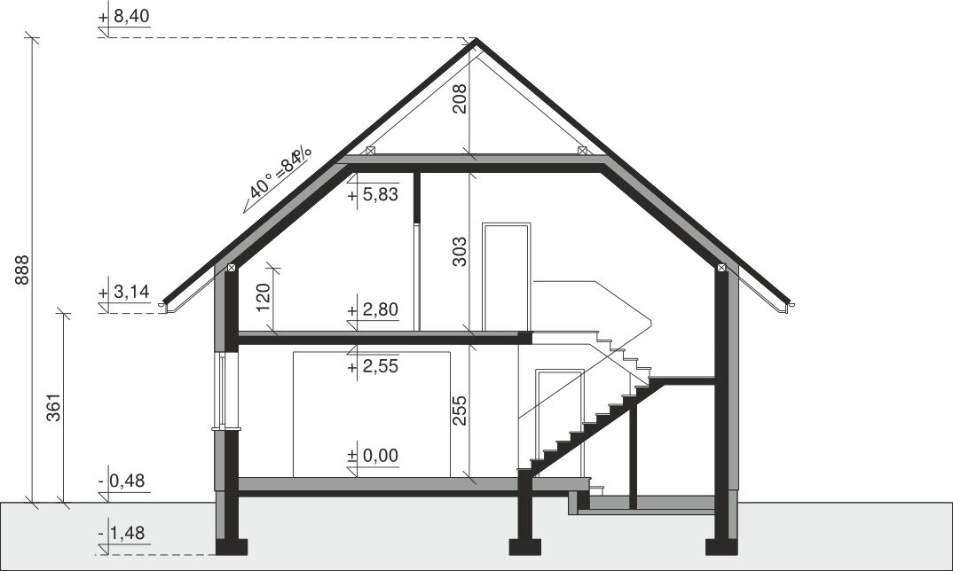 Ściany zewnętrzne: pustak 25 cm, styropian 20 cm. Ściany nośne: pustak 25 cm. Strop: monolityczny żelbetowy. Dach: kąt nachylenia 40°, pokrycie - dachówka ceramiczna lub betonowa. Instalacja solarna.