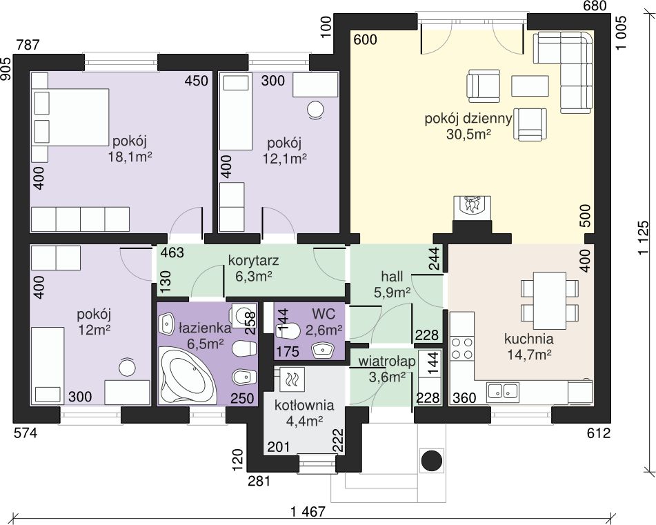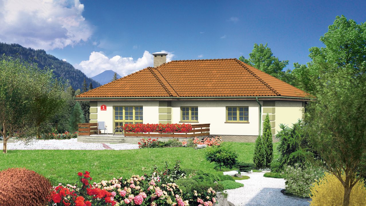 Graficzne opracowanie rzutów poglądowych widocznych na karcie projektu zostało wykonane przez Extradom.pl. Prezentowane przez Extradom.pl wizualizacje wykonane zostały przez autora projektu i należy poczytywać je jedynie za przykład i propozycję wykończenia, wizję architektoniczną autora projektu. Ostateczne wykończenie budynku może nastąpić na wiele sposobów. Szczegółowe rozwiązania zastosowane w oferowanej dokumentacji - w tym również ilość, lokalizacje i wygląd okien, drzwi, kominów - mogą w niewielkim stopniu różnić się od prezentowanej wizualizacji budynku.