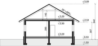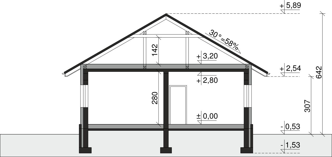 Ściany zewnętrzne: pustak 25 cm, styropian 15 cm. Ściany nośne: pustak 25 cm. Strop: monolityczny żelbetowy. Dach: kąt nachylenia 30°, pokrycie - dachówka ceramiczna lub betonowa.