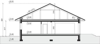 Ściany zewnętrzne: pustak 25 cm, styropian 20 cm. Ściany nośne: pustak 25 cm. Strop: monolityczny żelbetowy. Dach: kąt nachylenia 25°, pokrycie - dachówka ceramiczna lub betonowa.