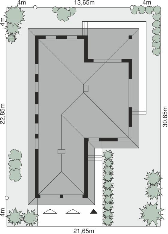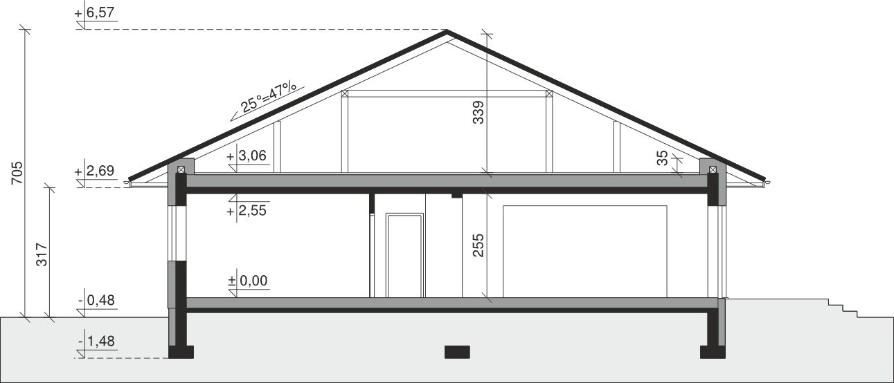 Ściany zewnętrzne: pustak 25 cm, styropian 20 cm. Ściany nośne: pustak 25 cm. Strop: monolityczny żelbetowy. Dach: kąt nachylenia 25°, pokrycie - dachówka ceramiczna lub betonowa. Instalacja solarna.