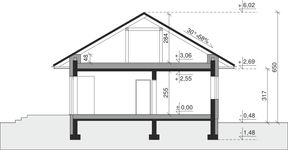 Ściany zewnętrzne: pustak 25 cm, styropian 20 cm. Ściany nośne: pustak 25 cm. Strop: monolityczny żelbetowy. Dach: kąt nachylenia 30°, pokrycie - dachówka ceramiczna lub betonowa.