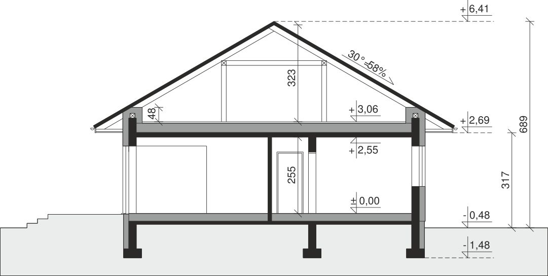 Ściany zewnętrzne: pustak 25 cm, styropian 20 cm. Ściany nośne: pustak 25 cm. Strop: monolityczny żelbetowy. Dach: kąt nachylenia 30°, pokrycie - dachówka ceramiczna lub betonowa. Instalacja solarna.