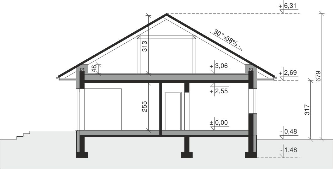 Ściany zewnętrzne: pustak 25 cm, styropian 20 cm. Ściany nośne: pustak 25 cm. Strop: monolityczny żelbetowy. Dach: kąt nachylenia 30°, pokrycie - dachówka ceramiczna lub betonowa. Instalacja solarna.