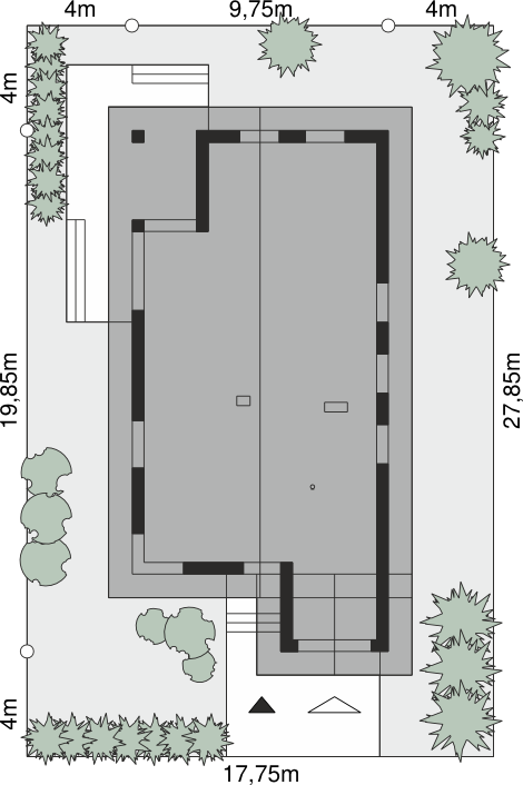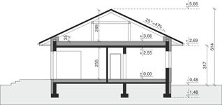 Ściany zewnętrzne: pustak 25 cm, styropian 20 cm. Ściany nośne: pustak 25 cm. Strop: monolityczny żelbetowy. Dach: kąt nachylenia 25°, pokrycie - dachówka ceramiczna lub betonowa. Instalacja solarna.