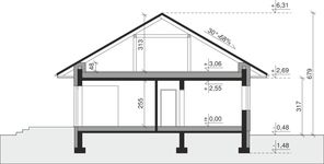 Ściany zewnętrzne: pustak 25 cm, styropian 20 cm. Ściany nośne: pustak 25 cm. Strop: monolityczny żelbetowy. Dach: kąt nachylenia 30°, pokrycie - dachówka ceramiczna lub betonowa. Instalacja solarna.