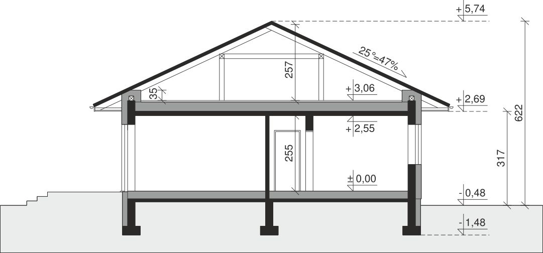 Ściany zewnętrzne: pustak 25 cm, styropian 20 cm. Ściany nośne: pustak 25 cm. Strop: monolityczny żelbetowy. Dach: kąt nachylenia 25°, pokrycie - dachówka ceramiczna lub betonowa. Instalacja solarna.