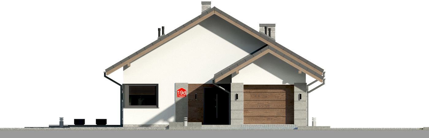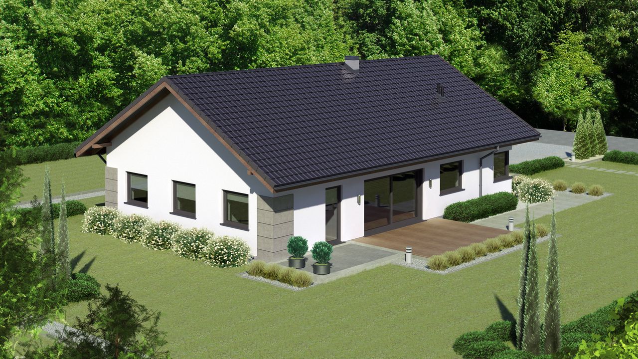 Graficzne opracowanie rzutów poglądowych widocznych na karcie projektu zostało wykonane przez Extradom.pl. Prezentowane przez Extradom.pl wizualizacje wykonane zostały przez autora projektu i należy poczytywać je jedynie za przykład i propozycję wykończenia, wizję architektoniczną autora projektu. Ostateczne wykończenie budynku może nastąpić na wiele sposobów. Szczegółowe rozwiązania zastosowane w oferowanej dokumentacji - w tym również ilość, lokalizacje i wygląd okien, drzwi, kominów - mogą w niewielkim stopniu różnić się od prezentowanej wizualizacji budynku.