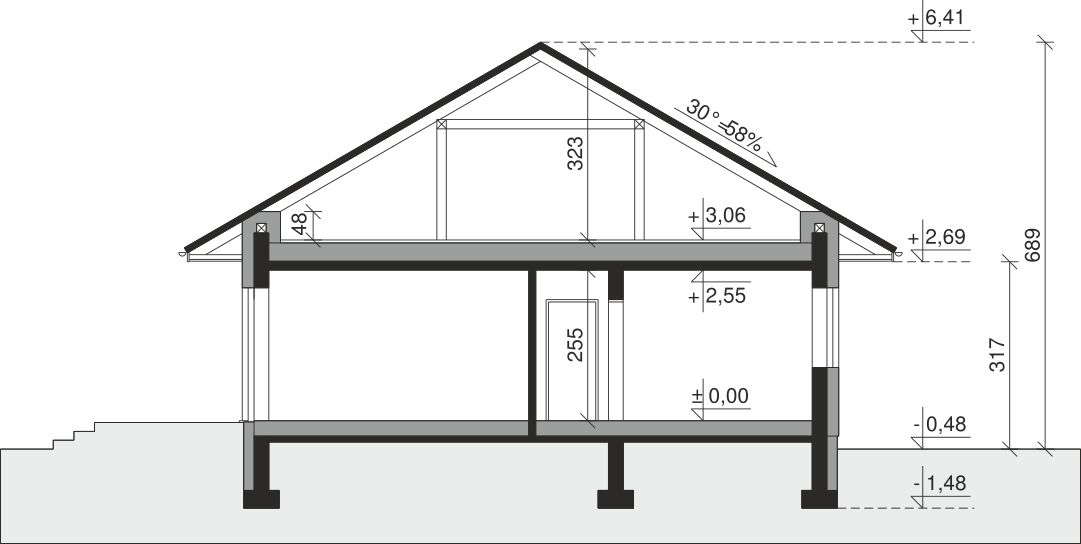 Ściany zewnętrzne: pustak 25 cm, styropian 20 cm. Ściany nośne: pustak 25 cm. Strop: monolityczny żelbetowy. Dach: kąt nachylenia 30°, pokrycie - dachówka ceramiczna lub betonowa. Instalacja solarna.