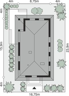 Graficzne opracowanie rzutów poglądowych widocznych na karcie projektu zostało wykonane przez Extradom.pl. Prezentowane przez Extradom.pl wizualizacje wykonane zostały przez autora projektu i należy poczytywać je jedynie za przykład i propozycję wykończenia, wizję architektoniczną autora projektu. Ostateczne wykończenie budynku może nastąpić na wiele sposobów. Szczegółowe rozwiązania zastosowane w oferowanej dokumentacji - w tym również ilość, lokalizacje i wygląd okien, drzwi, kominów - mogą w niewielkim stopniu różnić się od prezentowanej wizualizacji budynku.