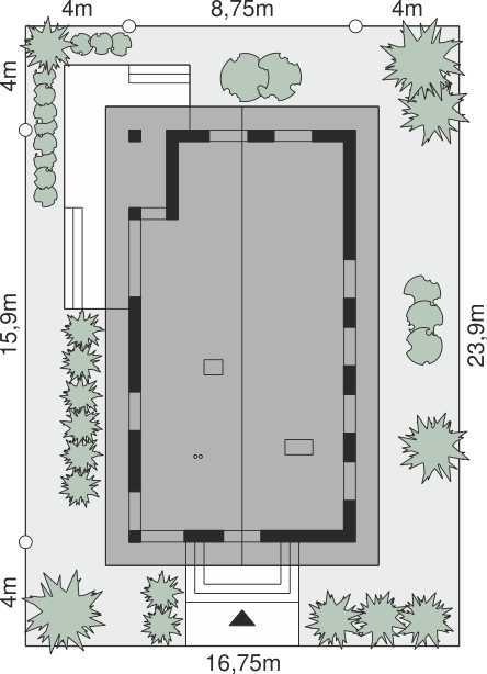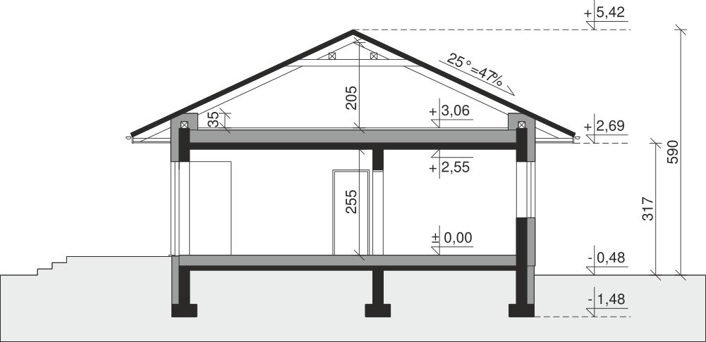 Ściany zewnętrzne: pustak 25 cm, styropian 20 cm. Ściany nośne: pustak 25 cm. Strop: monolityczny żelbetowy. Dach: kąt nachylenia 25°, pokrycie - dachówka ceramiczna lub betonowa. Instalacja solarna.