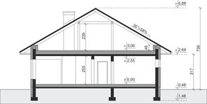 Ściany zewnętrzne: pustak 25 cm, styropian 20 cm. Ściany nośne: pustak 25 cm. Strop: monolityczny żelbetowy. Dach: kąt nachylenia 30°, pokrycie - dachówka ceramiczna lub betonowa. Instalacja solarna.