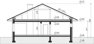Ściany zewnętrzne: pustak 25 cm, styropian 20 cm. Ściany nośne: pustak 25 cm. Strop: monolityczny żelbetowy. Dach: kąt nachylenia 25°, pokrycie - dachówka ceramiczna lub betonowa.